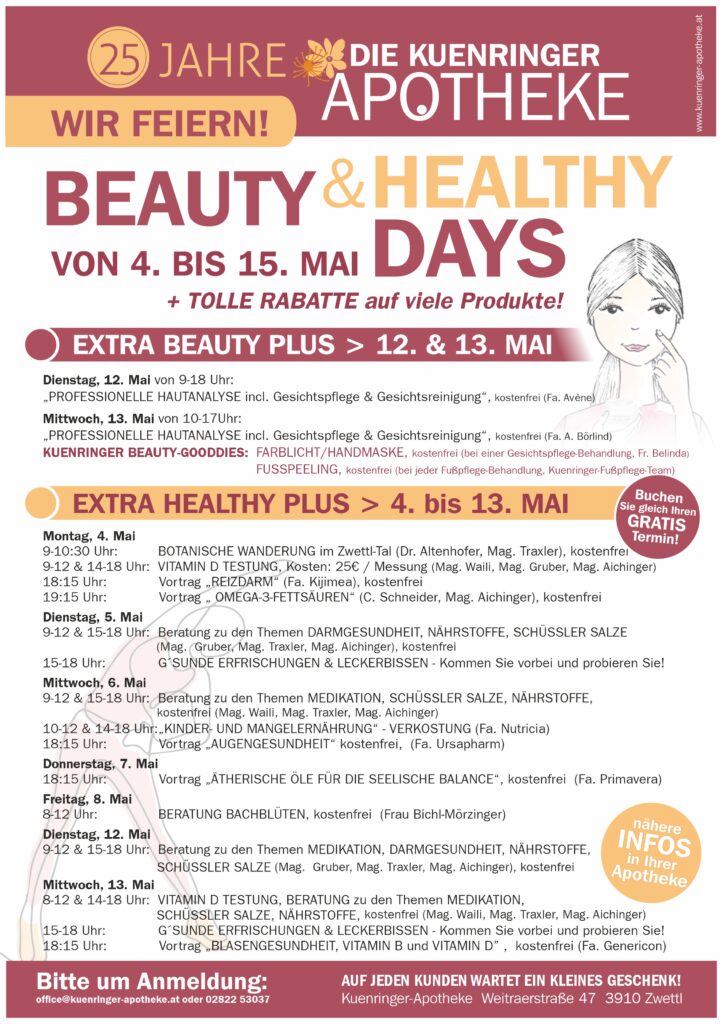 Aus diesem Grund wollen wir zwei Wochen lang im Mai das Thema Gesundheit und Wohlergehen aufgreifen und Sie zu besonderen Vorträgen, Workshops und Beratungen einladen! Freuen Sie sich auf ein abwechslungsreiches Programm samt interessanter Aktionen! :):):) (Anmeldung nicht vergessen! :)!) :):):):)